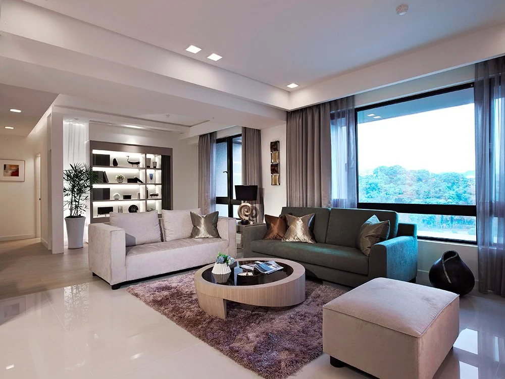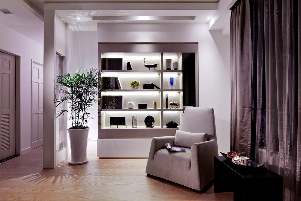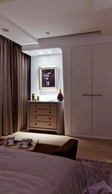 我們將原有三房變更為二房,敲除最靠近客廳的最小房隔間,擴大公共區域的起居空間,配置精品櫃兼書櫃,不僅增加視覺的寬闊度,也方便長輩無障礙的起居動線。