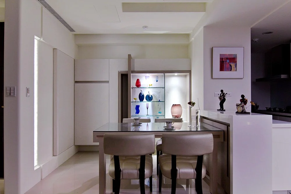 客廳電視主牆旁設計為多功能隱藏收納櫃,同時兼具主牆面設計感與隱藏收納空間。 餐廳用餐區的精品櫃體設計和開放式廚房早餐台,視覺上設計為一體成型感,不僅用餐動線更流暢,也保有整體空間的高雅設計感。